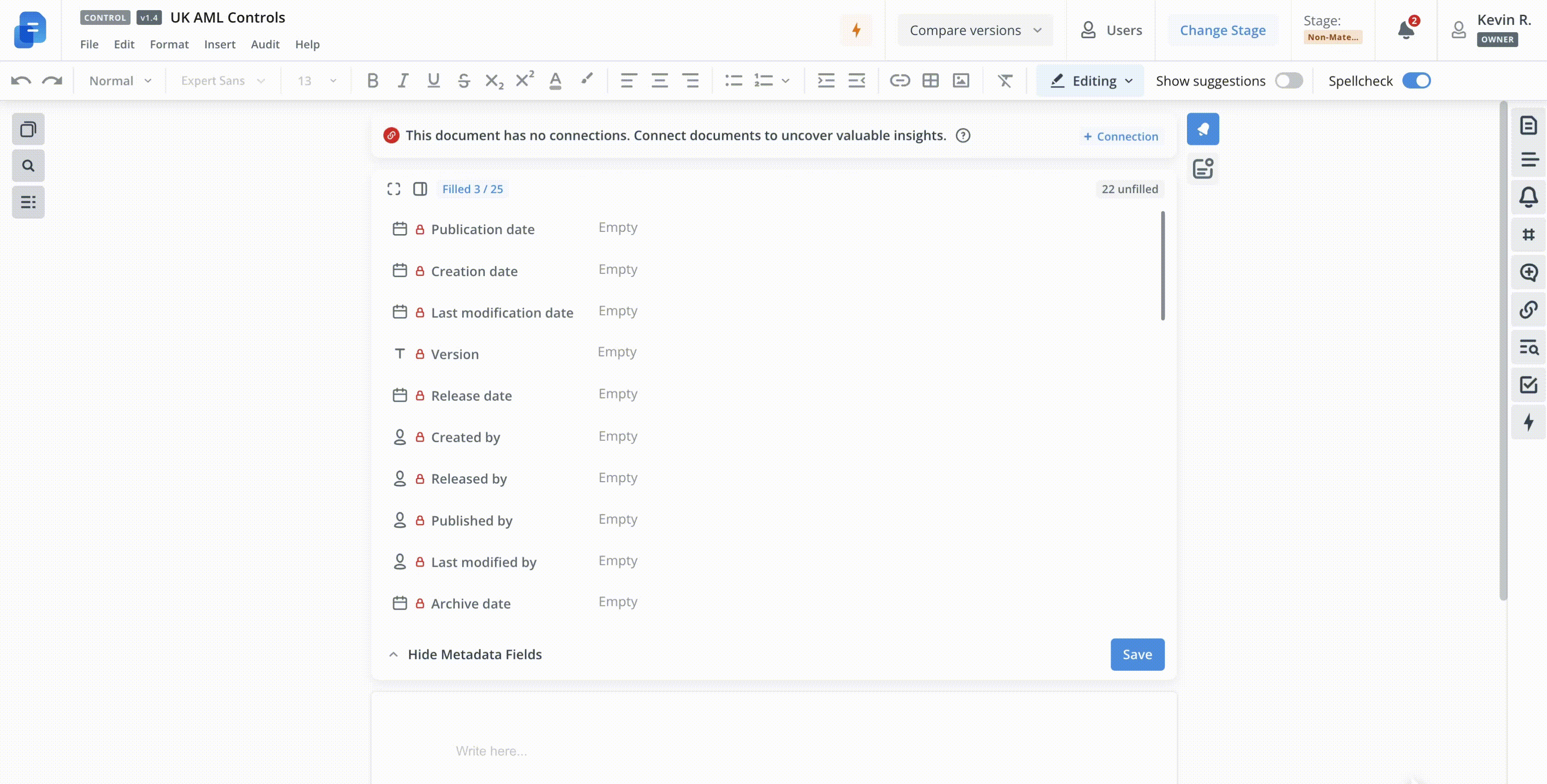 In addition to the existing stages, there is also Non-Material Changes functionality available that allows document owners and editors to make small insignificant changes (e.g. grammar fix, small correction, change relative content or tags) without creating a new version.