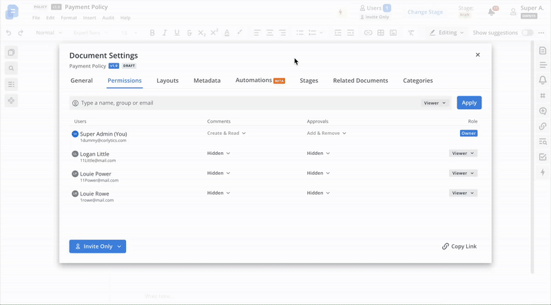 - To invite all users (with Policy Management access) to the document with the Viewer role: