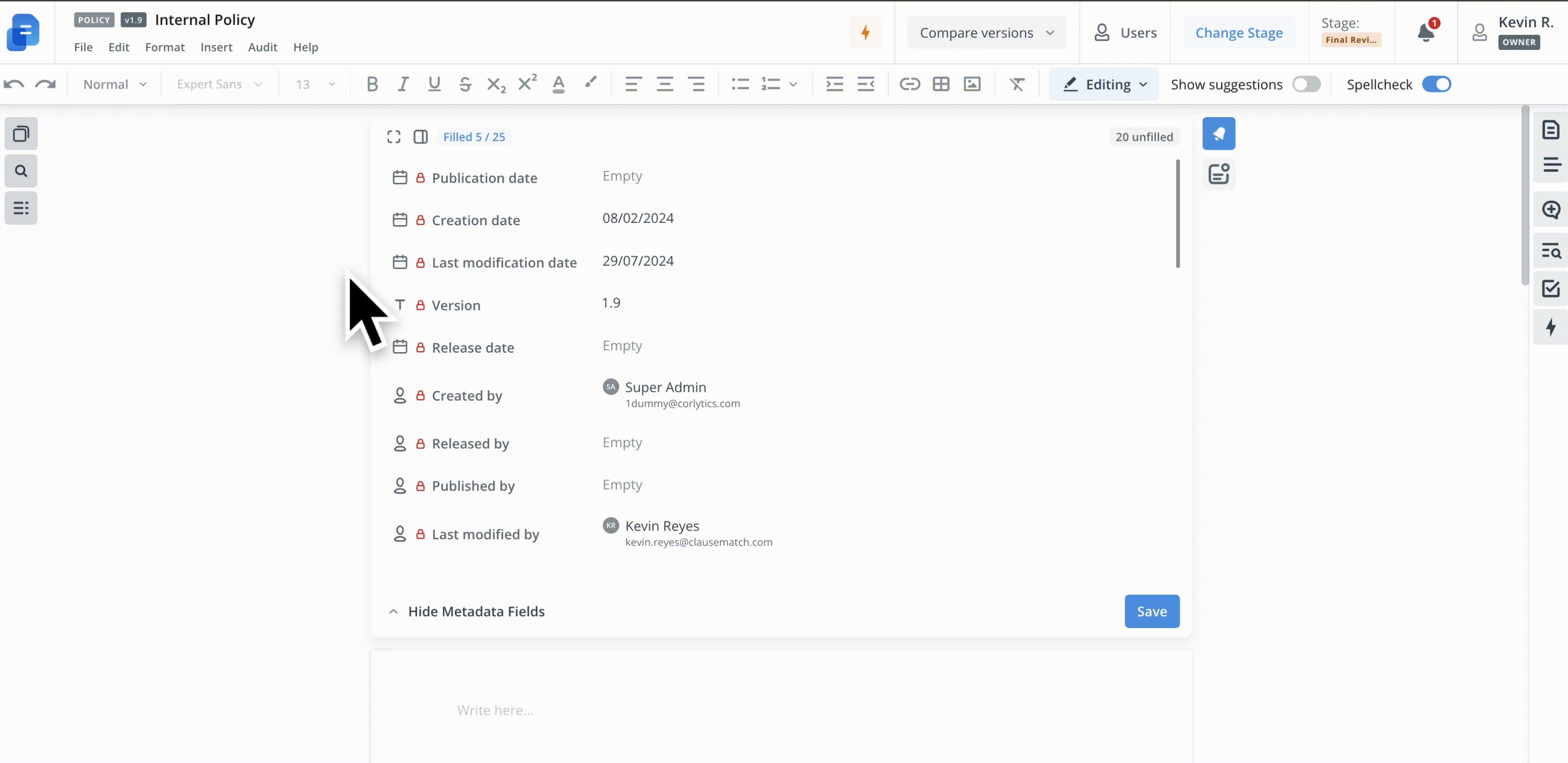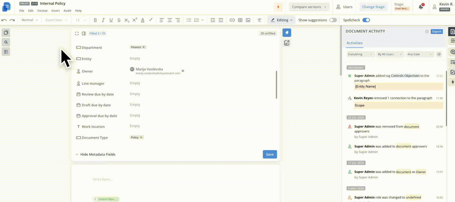 Across versions of a document, changes can be tracked through a comprehensive and easily accessible audit trail.